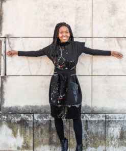 Our ART 1 dress is truly a work of art. This piece can be worn for almost any occasion. You can wear it casually with some tights, boots and a cool jacket, or you can uplift if with a nice pair of heels and a classy coat. It is suitable for any time of the year, since it can be layered underneath or over. The red, white and silver hand painted patterns give it that special MammaMia touch which will make you stand out in the crowd.